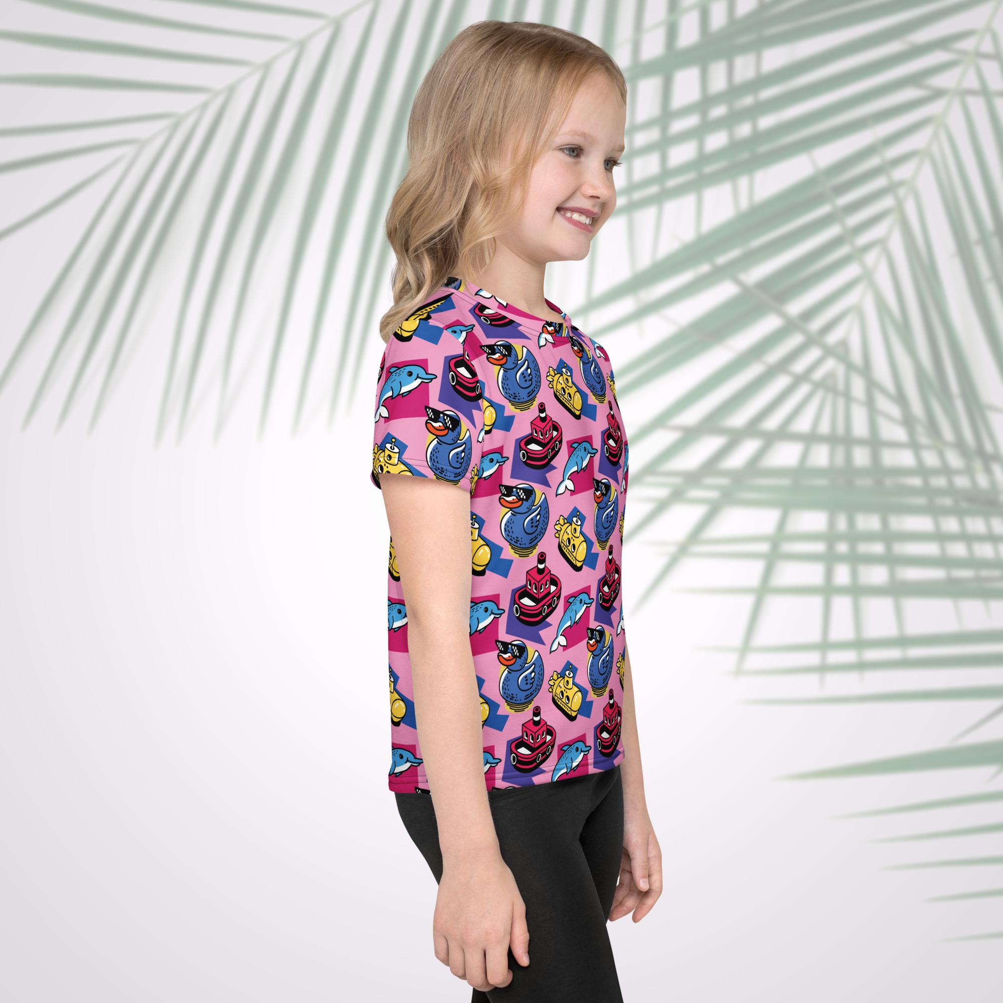 Make a splash with the ultimate kids’ tee! Featuring a bold, retro pattern of dolphins, tugboats, and a “Deal With It” duck, this colourful design captures the fun, carefree spirit of summer. Made for comfort and style, it’s perfect for active kids ready for standout adventures in the sun.