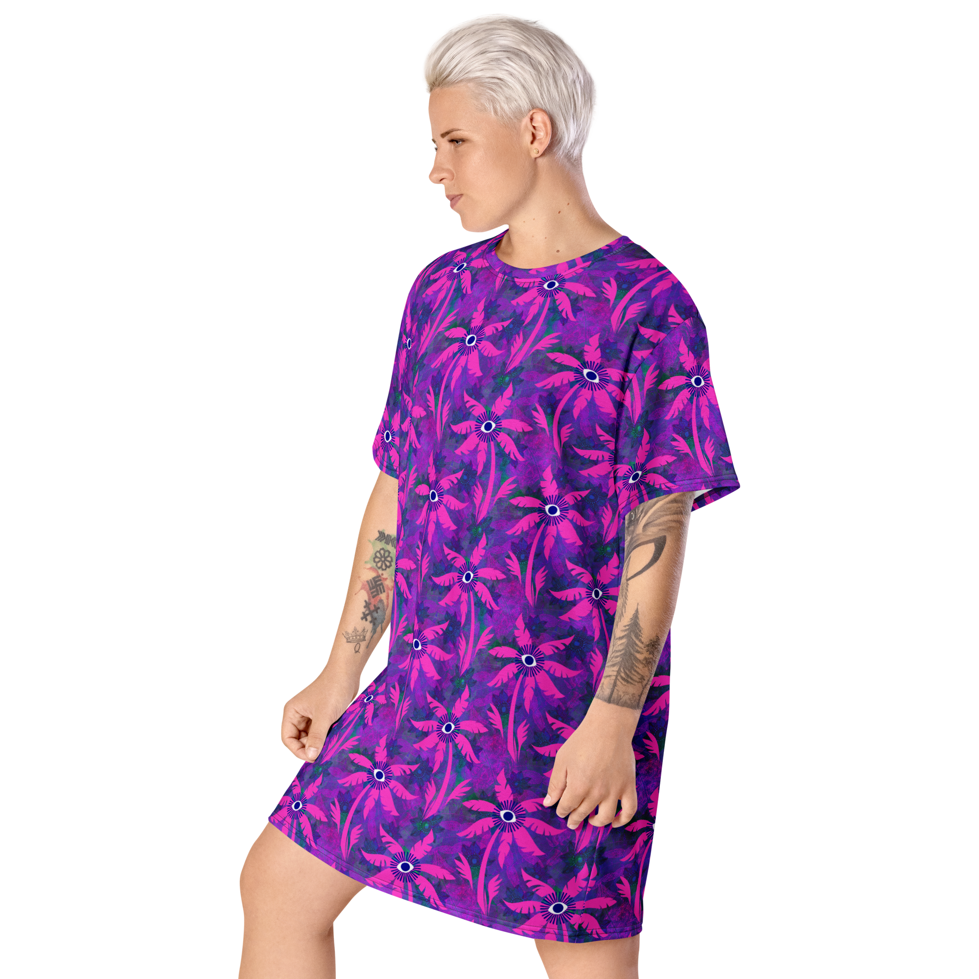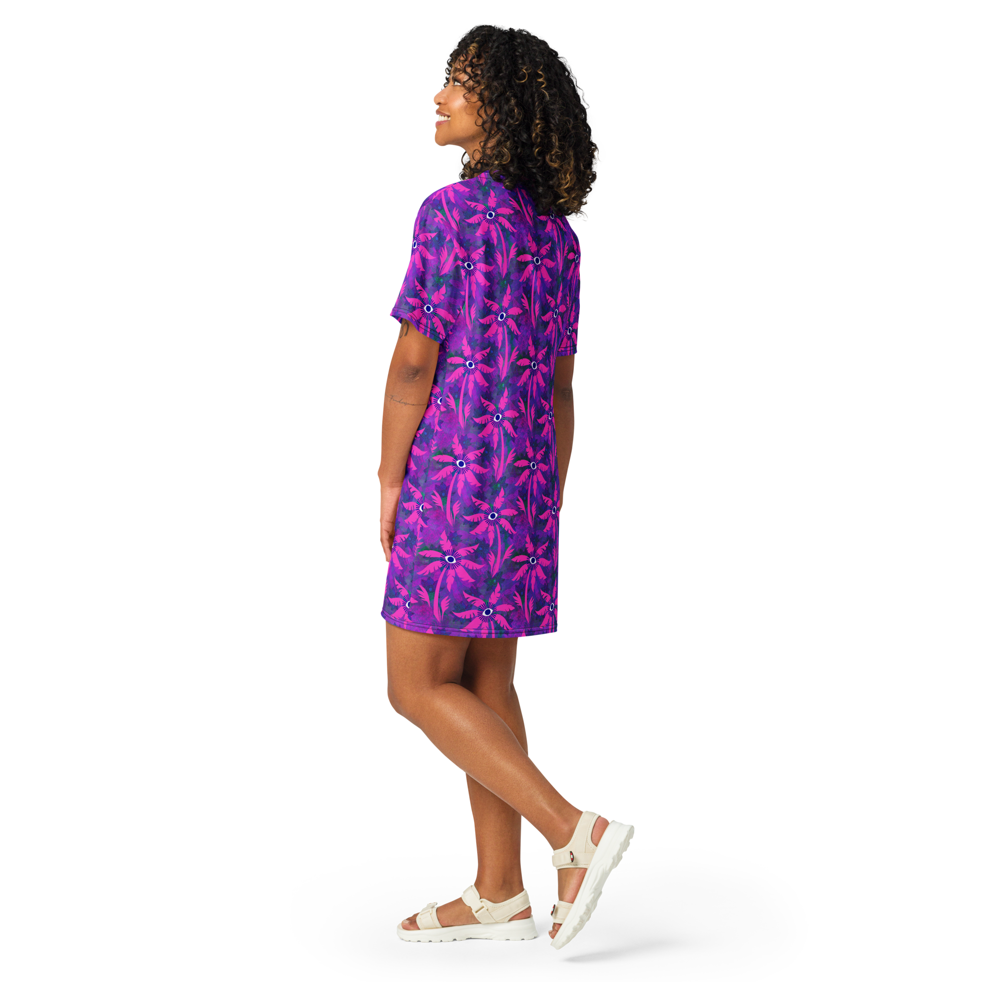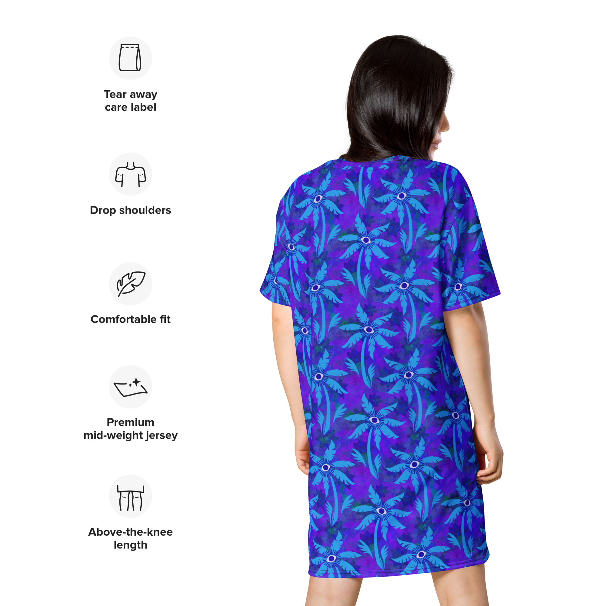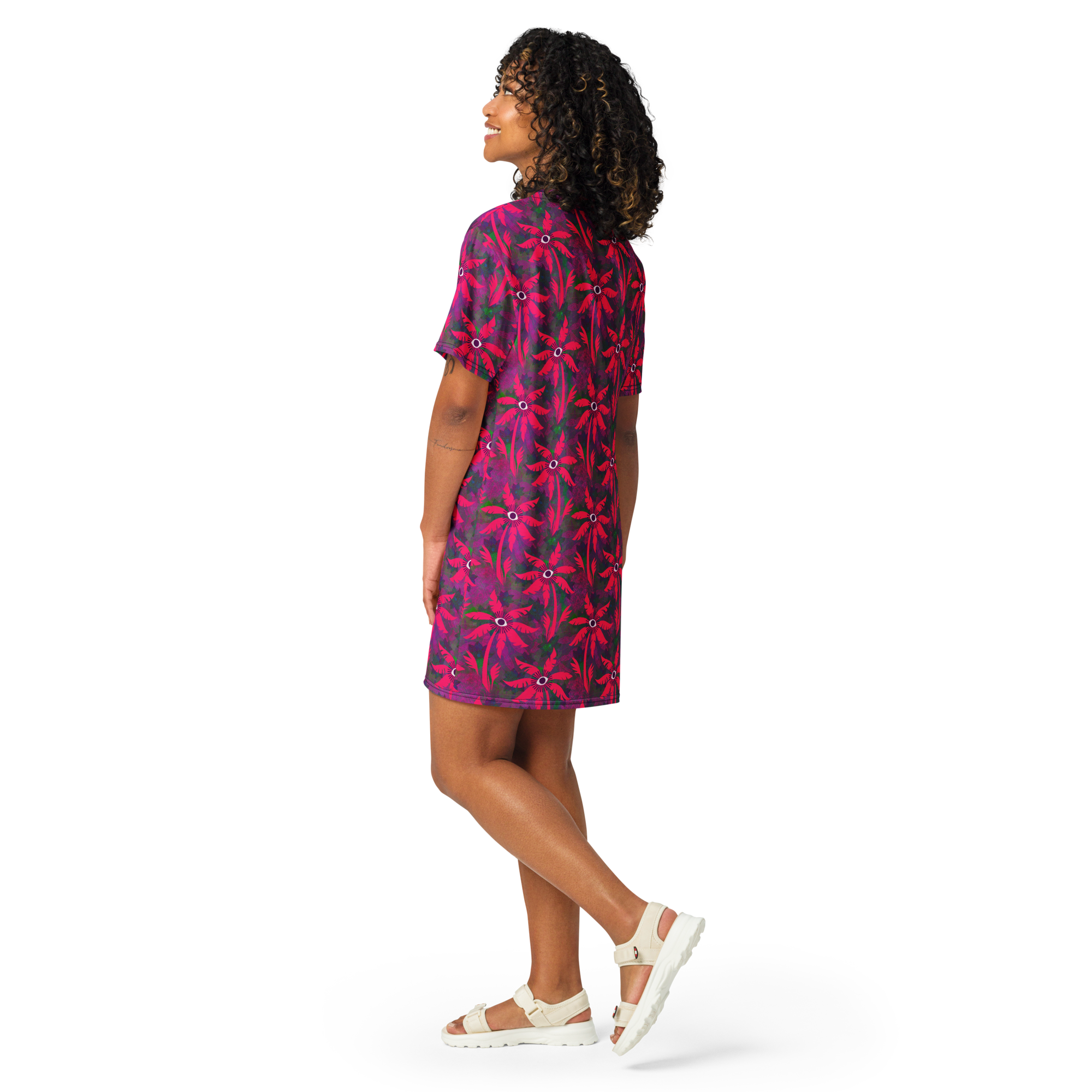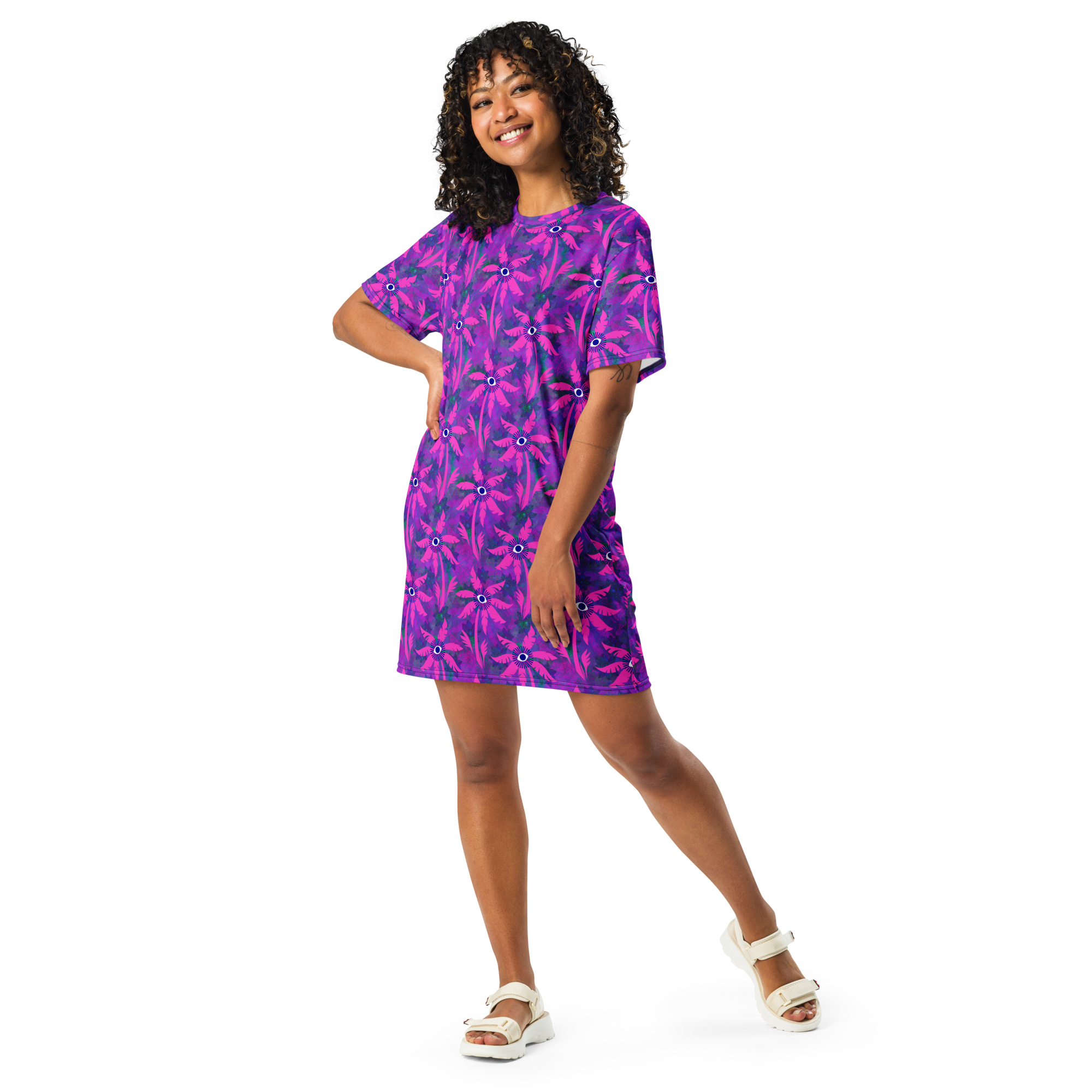 This delightful oversized T-shirt dress is the perfect companion for your beach adventures! Its lightweight and flexible design pairs wonderfully with a bikini and tote for sunny days, or with a light jacket for warm evening dinners.