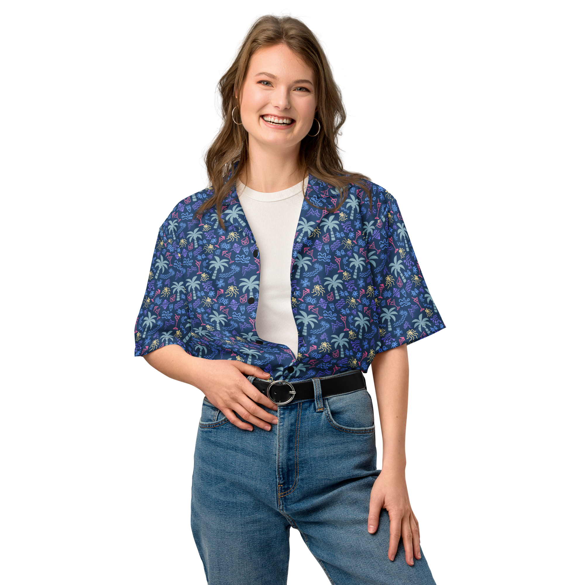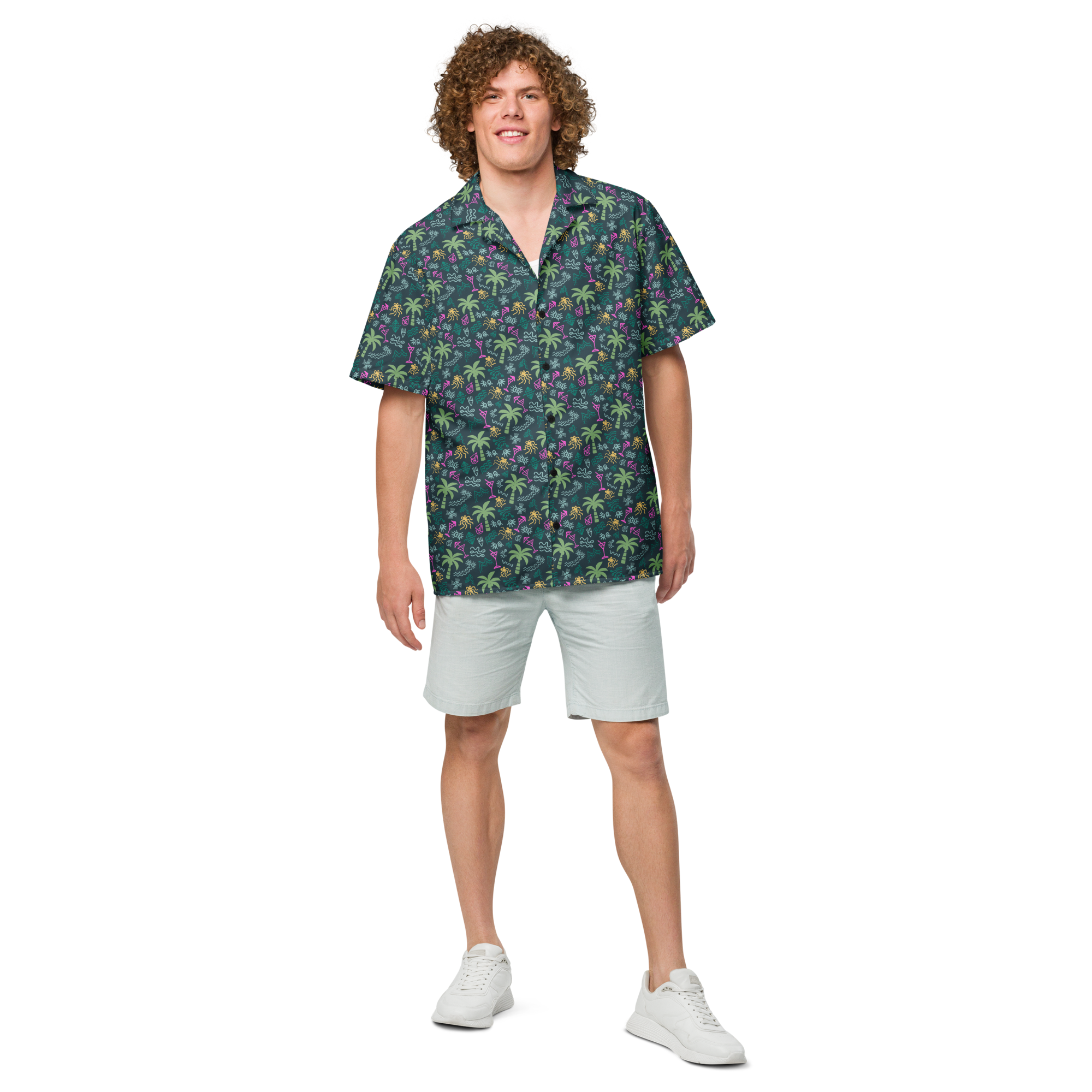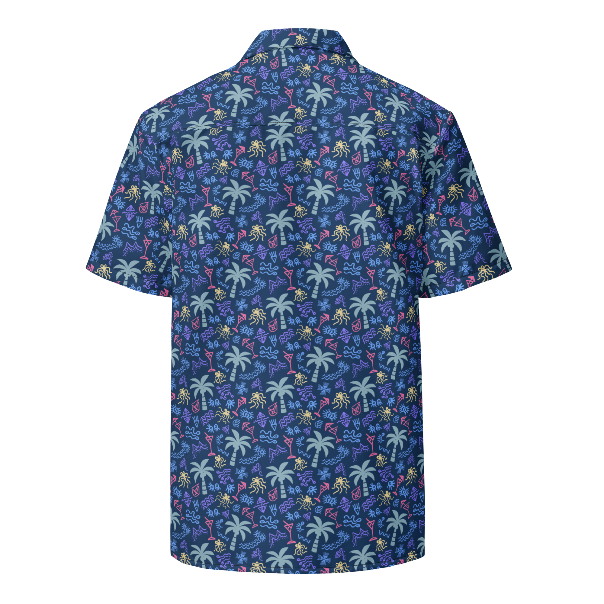 This lightweight, moisture-wicking shirt is an ideal summer choice, combining comfort with unique details. The “Coral Reefer” design features playful hand-drawn palm trees, sea shapes, and cocktails, capturing the carefree vibe of beach life.