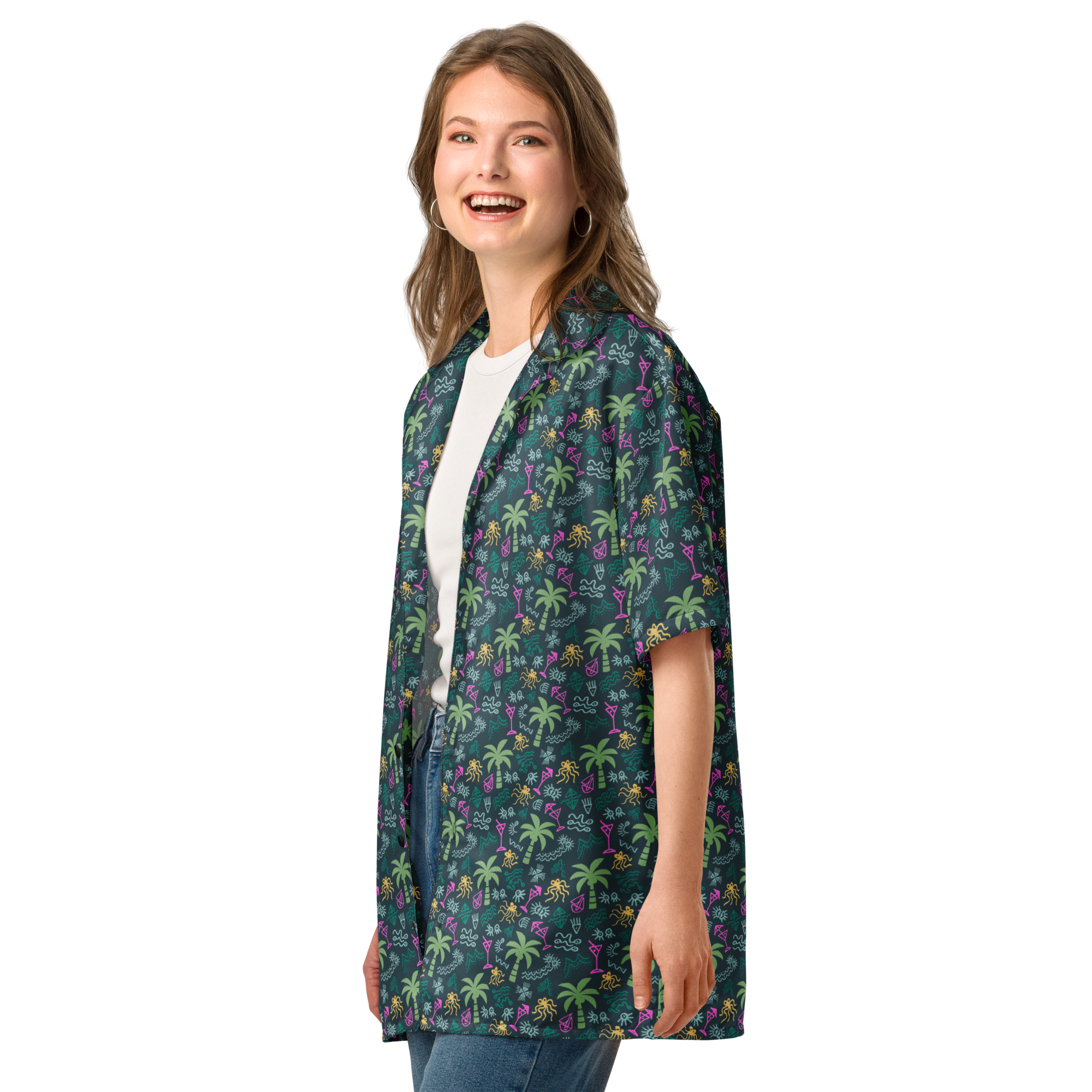 This lightweight, moisture-wicking shirt is perfect for summer, combining effortless comfort with shifting colours and unique details. The “Coral Reefer” design adds a playful twist to island style, featuring hand-drawn palm trees, sea shapes, and cocktail doodles. It encapsulates the fun, carefree vibe of beach life for those who appreciate a lighthearted take on paradise.